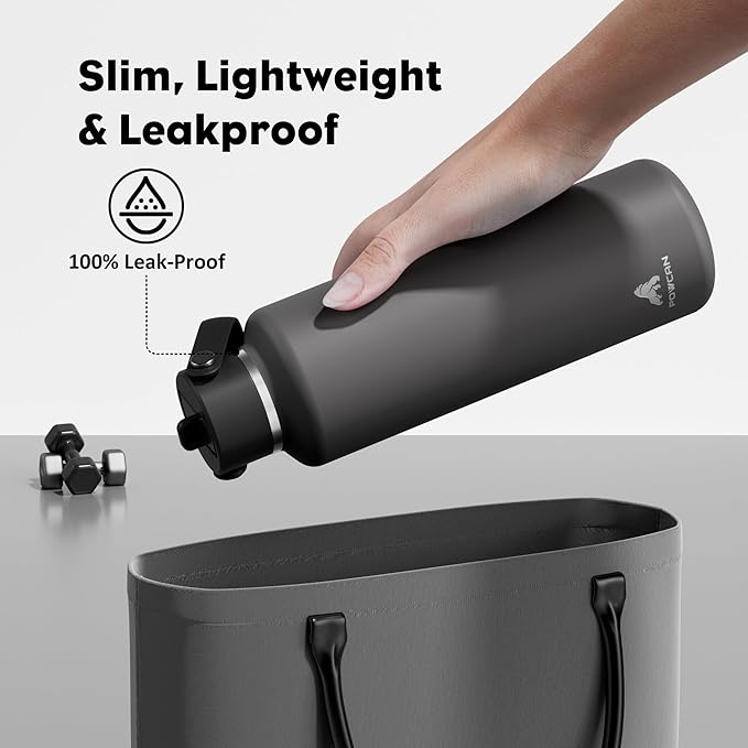POWCAN 24 oz Slim Insulated Water Bottle: Leakproof, Lightweight, Top Handle, Stainless Steel Water Bottle with Straw for Sport, Gym, Fitness, Office, Home, Commute, Workouts, Boy, Men (Stone Gray)