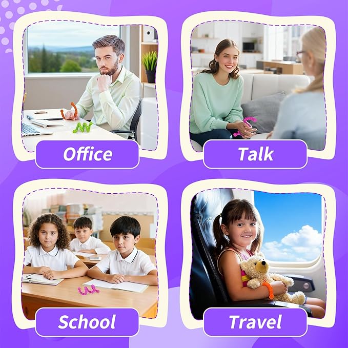 - Quantity: 6 fidget sticks per set Length: 11.1 inches (28.2 cm) per stick Colors: 6 unique colors (1 stick per color) Textures: 6 distinct textures for sensory variety Material: Reinforced, BPA-free silicone with flexible internal wire Safety: CPC-tested, smooth rounded edges Cleaning: Wipe or rinse with water Recommended Ages: 3+ (suitable for kids, teens, and adults) Use Cases: Classroom, home, travel, offices, waiting rooms