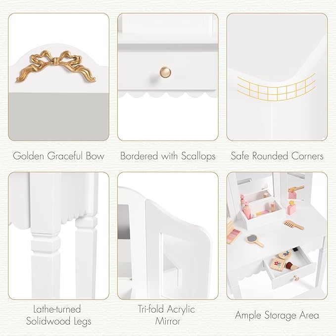 - 【ADORABLE APPEARANCE】This vanity table and chair set features a golden bow as its main design element, complemented by shell-shaped scalloped edges on the panels. The table and chair legs are crafted from solid wood with a turned design for added elegance.Your little princess is sure to fall in love with it!