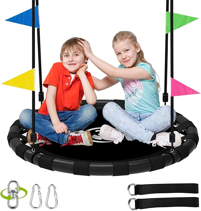 - 【Full Equipment & Double The Fun】 The outdoor kids swing includes 2 reinforced hanging straps and 2 heavy-duty stainless steel carabiners. No need to buy extra straps or carabiners. Additionally, the 4 decorative flags add to the fun of swinging, and a central swivel spinner allows for different swing experiences