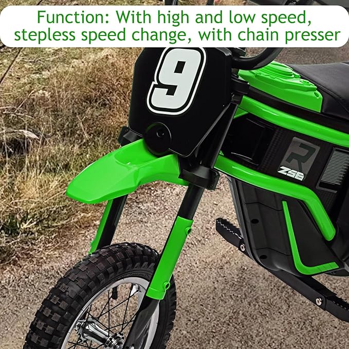 - 【3 Safe Speed Modes】For safety, the dirt bike is equipped with three speed modes: Low (5.0 mph / 8 km/h), Medium (7.5 mph / 12 km/h), and High (14.29 mph / 23 km/h). Parents can easily control the speed to suit their child's skill level, ensuring a safe and enjoyable riding experience for their children.