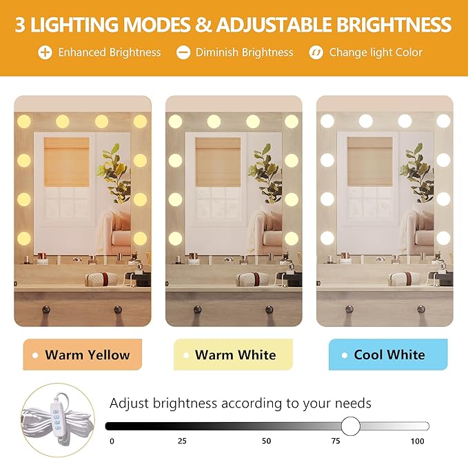 - 【Lighted Vanity Desk with Mirror – 3-Color Dimmable LED Lights】This 43" makeup vanity features a lighted mirror with 10 bulbs offering warm, natural, and cool lighting. Easily adjust brightness to create the perfect setting for makeup, skincare, or video calls.