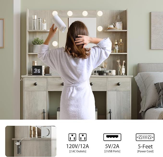 - 【Vanity Desk with Power Outlet & USB Ports】Stay connected while you get ready. This makeup table includes 2 AC outlets and 2 USB ports, perfect for charging phones or powering hair dryers, straighteners, or curling irons.