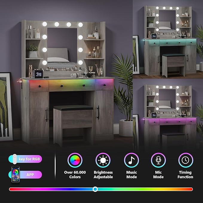 - 【App-Controlled RGB LED Light Strip – Modern Ambience】Personalize your beauty space with an RGB light strip under the tabletop. Easily control colors, brightness, and dynamic modes via mobile app for a fun and vibrant dressing experience.
