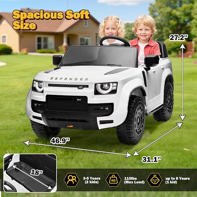 - 【Spacious Size Design for Kids】The 24V 2 seater ride on toys car features a generously sized build with an extra-wide 18-inch seat, comfortably accommodating two children (3-5 years) or one older child (up to 8 years). Ample legroom and a 110 lbs weight capacity make it perfect for playdates and sibling sharing.