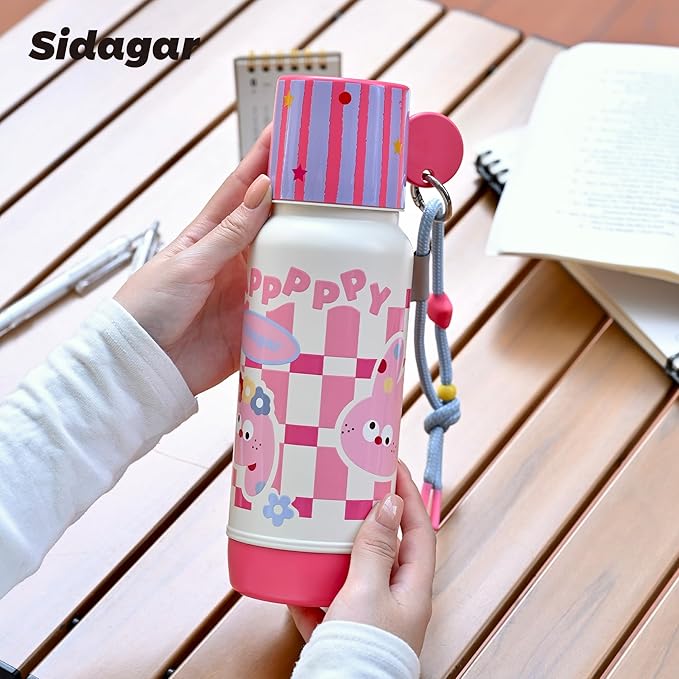 20 oz Cute Tumbler witn Lid and Straw, Insulated Stainless Steel Kids Water Bottle with Strap, Travel Leak Proof Coffee Cup, Rabbit