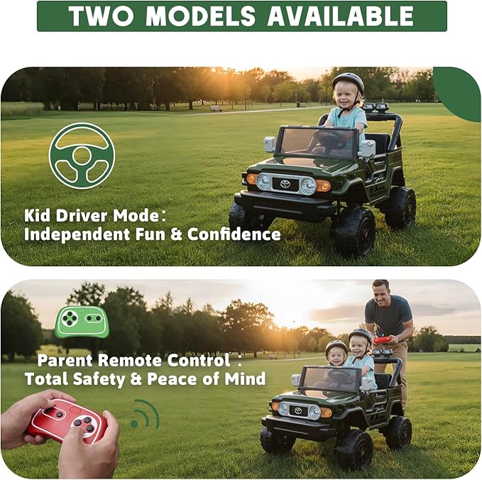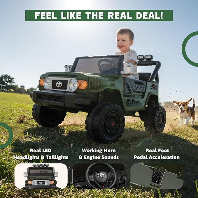 - 【Licensed Toyota FJ 24V Ride-On Car — Realistic Adventure for Two】This officially licensed Toyota FJ 2 seater ride on car for kids brings the thrill of real driving to your backyard. Designed for children ages 3–8, this 24v ride on toy supports up to 110 lbs and features a wide dual seat for siblings or friends. With authentic Toyota styling and sturdy build, it' s a fun and durable electric car for kids to explore safely and confidently.