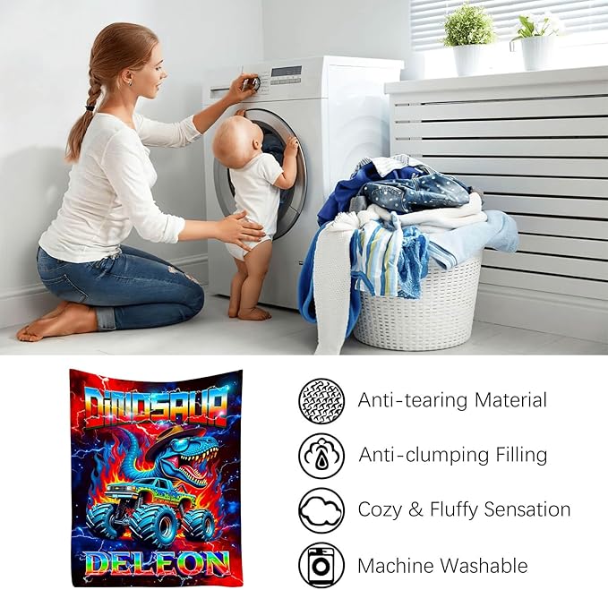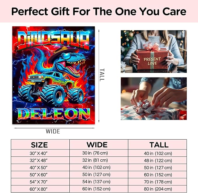 Custom Truck Blanket with Name Personalized Dinosaur Throw Blanket for Boys Cars Lovers Gifts for Couch Sofa Bed Decor(Boy-04)