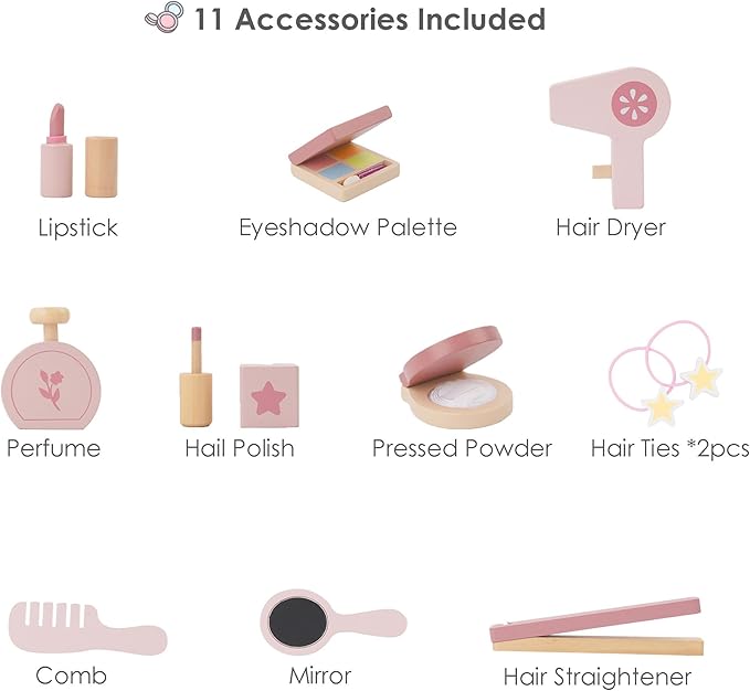 - 11 Accessories for Endless “Make Me Pretty!” Moments: Your child gets their own lipstick, perfume bottle, powder puff, nail polish, blow dryer, mirrors, hair ties, comb—everything they need to host a full pretend salon.No spills. No mess.Just pure imaginative play