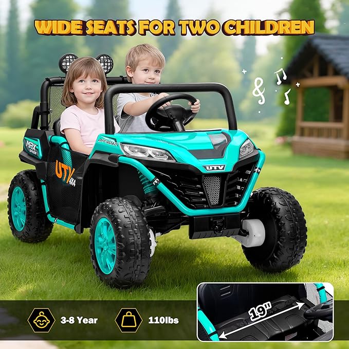 - 【Spacious Two-Seat Design】This 2-seater ride on car is designed with seat belts to comfortably accommodate two children (aged 3–5) or one older child (up to 8 years old). Supported by a sturdy spring suspension system on all 4 wheels, it ensures a smooth ride with a maximum load capacity of 110 lbs.