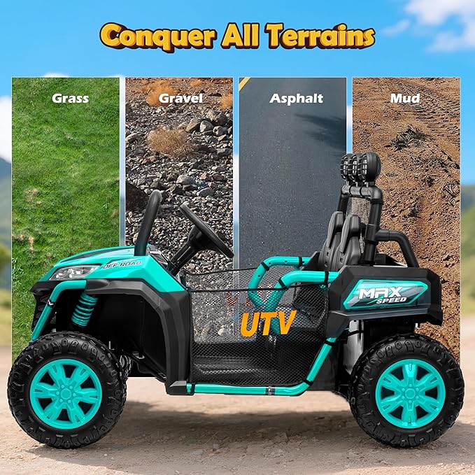 - 【Two Driving Modes】Featuring two driving modes, this electric UTV allows children to self-drive using the foot pedal accelerator. Parents can also take control with the included remote control, which offers three adjustable speeds (1.86 mph, 2.8 mph, and 4.04 mph) for supervised fun and safe driving practice.