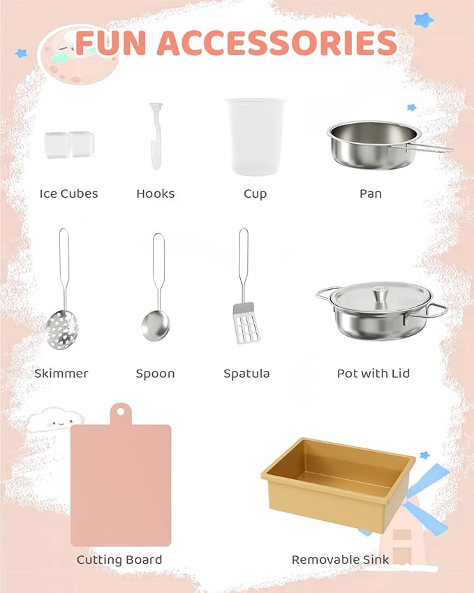 - DURABLE & CERTIFIED SAFE DESIGN: Play kitchen is crafted from solid MDF and engineered wood. Kitchen toy set is built for lasting durability and finished with CPSIA & ASTM-certified paints, featuring smoothly rounded corners to ensure complete peace of mind for your little ones
