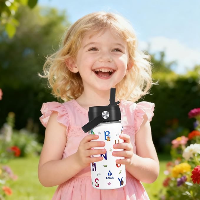 Alphabet Kids Water Bottle With Straw Lid,14 oz Stainless Steel Travel Bottle,Double Wall Leak Proof Kids Cup,Insulated Tumbler for Toddlers,Metal Animal Bottle for School Boys Girls