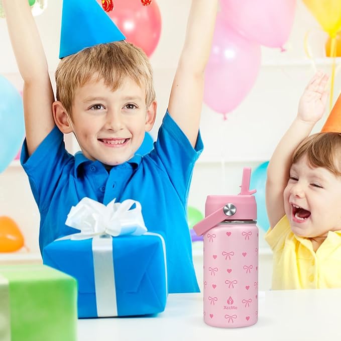 Kids Water Bottle With Straw Lid,Pink Bow 14 oz Stainless Steel Travel Bottle,Double Wall Leak Proof Kids Cup,Insulated Tumbler for Toddlers,Metal Bottle for School Boys Girls