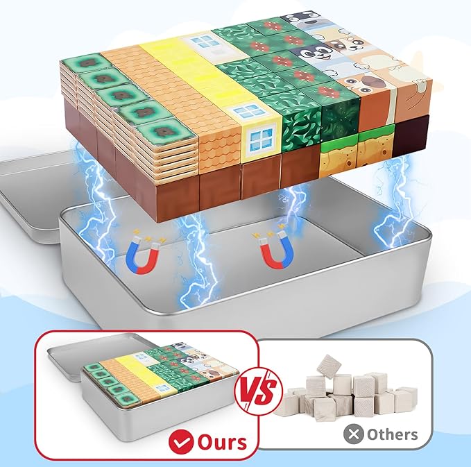 - 【Magnetic Blocks with Portable Iron Box】This 70-piece travel magnetic blocks set comes with a sturdy iron box that prevents loss and doubles as a magnetic play base. Kids can build on tables, fridge doors, or any metal surface for screen-free creative fun anywhere