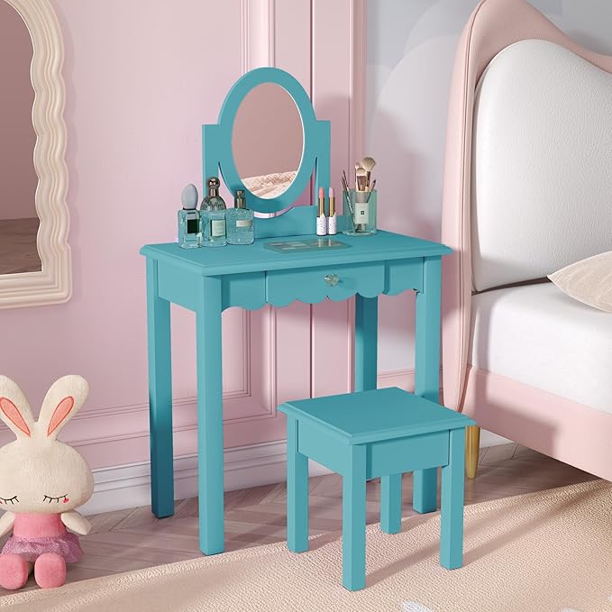 HLR Kids Vanity,Little Girls Vanity Set with Mirror and Stool,Wooden 2 in 1 Princess Makeup Desk Dressing Table with Detachable Top, Toddler Vanity Dresser Set with Drawer for Little Girls,Blue