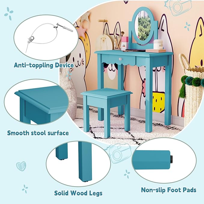 - 【Durable & Safe Lead-free Paint Finished】Your child's safety is our top priority. This toddler makeup vanity with superior strong, durable density board and solid wood. All the paints we use are lead-free and have no peculiar smell to damage kids' health, making it a safe and healthy choice for your child