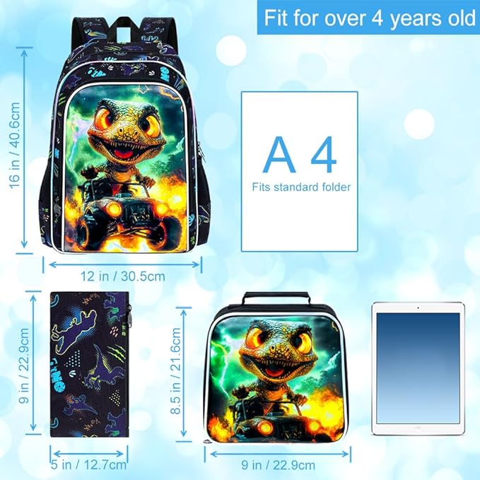 - 【Boys Backpack 3 in 1】Includes a dinosaur backpack for boys(17"x 12"x 5.5"In) + a lunch box (9"x 8.5"x 3"In) + a pencil bag. Can be given as a surprise gift to kids on Christmas/Birthday.