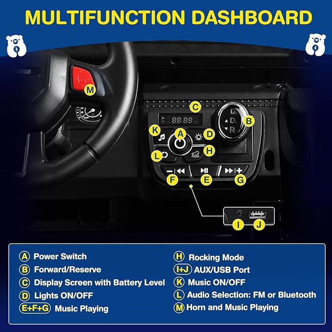 - ENDLESS FUN: Equipped with multiple music modes to choose from, including Bluetooth, USB, AUX, MP3, and FM, which will creat endless fun for your child's adventure. Features realistic engine startup sounds and lifelike driving operations, allowing children to embark on a thrilling riding experience.