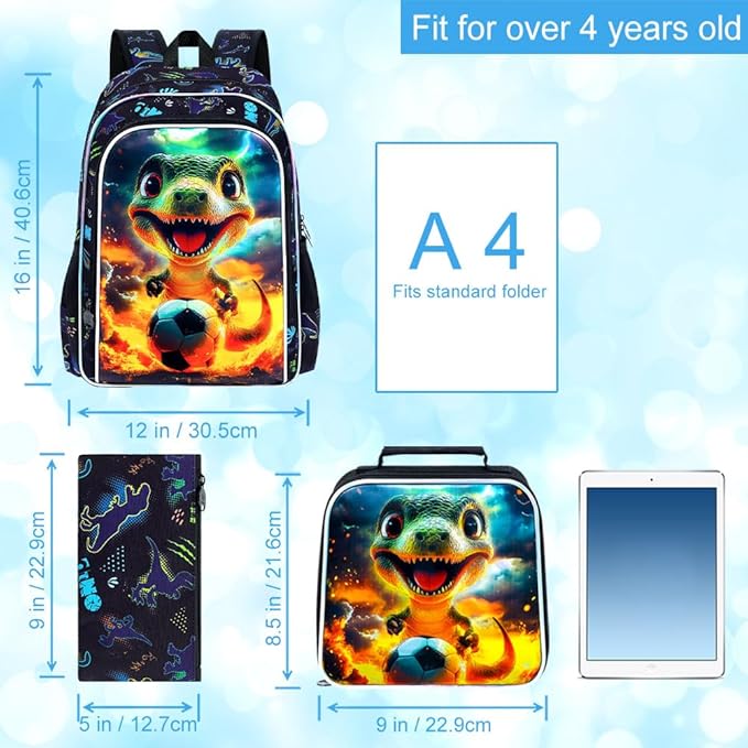 - 【Boys Backpack 3 in 1】Includes a dinosaur backpack for boys(17"x 12"x 5.5"In) + a lunch box (9"x 8.5"x 3"In) + a pencil bag. Can be given as a surprise gift to kids on Christmas/Birthday.