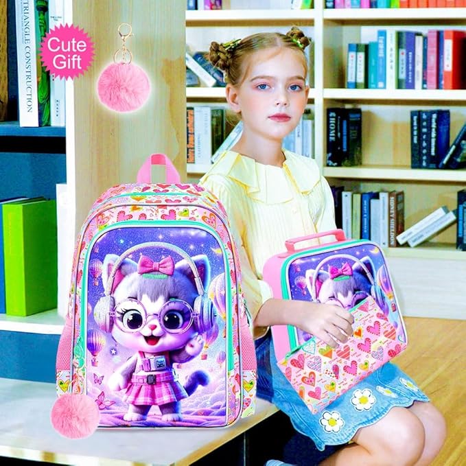 - 【Thoughtful Girls Backpack Set】 The set includes a 16-inch girls cat backpack, a 9-inch lunch box, a pen case, a cute furry pom and an anti-loss name tag. The carefully matched combination meets the travel needs of girls.