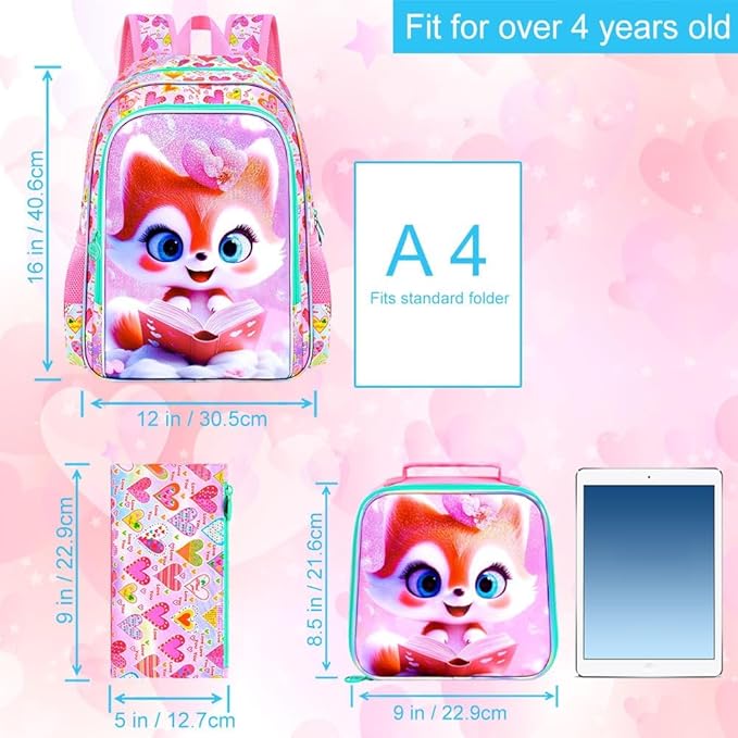 CCJPX 16" Fox Backpack for Girls, 3Pcs Kids Bookbag with Lunch Box, Water Resistant Elementary School Bag for Kindergarten Preschool Toddler (Pink)