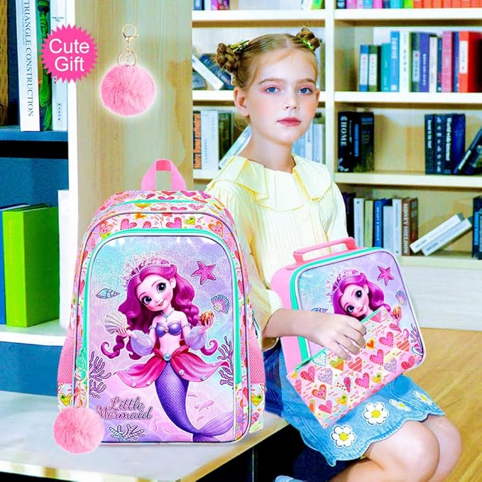 - 【Thoughtful Girls Backpack Set】 The set includes a 16-inch mermaid backpack, a 9-inch lunch box, a pen case, a cute furry pom and an anti-loss name tag. The carefully matched combination meets the travel needs of girls.