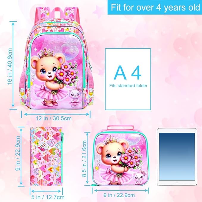 CCJPX 16" Bear Backpack for Girls, 3Pcs Kids Bookbag with Lunch Box, Water Resistant Elementary School Bag for Kindergarten Preschool Toddler (Pink)
