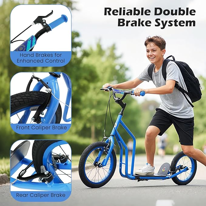 - 2 Ultra Large Inflatable Tires: This youth scooter comes with a 16-inch front wheel and a 14-inch rear wheel, providing smooth and comfortable riding. The inflatable wheels with non-slip texture can tackle a variety of surfaces, including cement road, brick road, wood floor, asphalt road, etc.