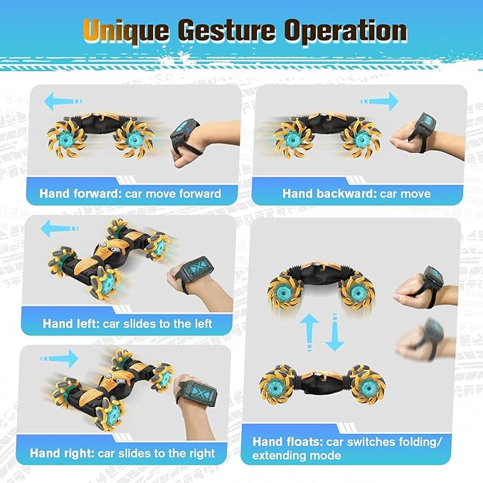 - Hand & Remote Control: Want to command your toy car with cool gestures? This stunt RC car features dual control via traditional remote and smartwatch gestures, enabling precise movement and transformation through gesture recognition. It so cool!