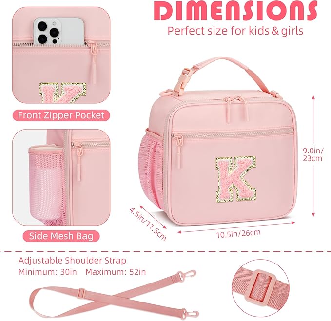 - Personalized Initial Style: This reusable lunch bag for girls features a prominently hand-stitched initial letter patch, offering a soft touch and secure attachment for long-lasting use. With its trendy and simple design, this initial-insulated lunch bag is perfect for toddlers, kids, teens, and adults who love to express their unique style
