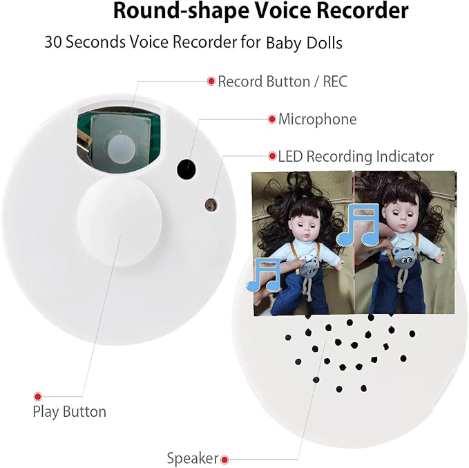- Interactive Fun & Voice Recording:A small voice box on the doll’s tummy lets your child record their own voice or favorite songs(Whether it's a "Happy Birthday" song or a Christmas carol, or a blessing for a child, any sound can be recorded).