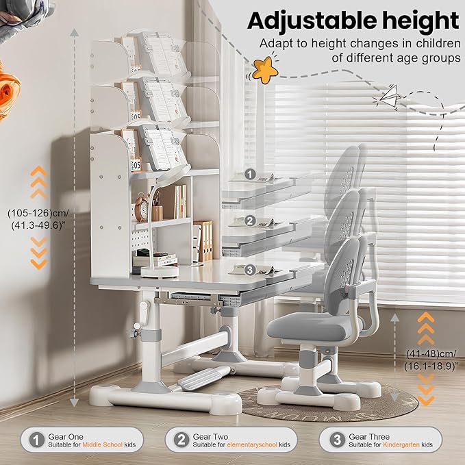 - Adjustable Height: Adjustable height desk and chair set grows with your child, featuring 21cm hand-cranked desk lift and 7cm chair adjustment for optimal ergonomics from ages 3-12
