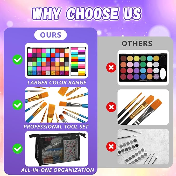 - Everything Organized: This all-in-one kit has it all !Unleash creativity with 54 colors, 8 split cake colors, 14 brushes, 8 reusable face paint stencils, 4 sticker stencils, 2 gem stickers, 4 sponges, 4 finger sponges, 1 spray bottle. A premium zippered storage bag keeps all colors and tools neatly organized, clean, and portable for parties, festivals, or travel.