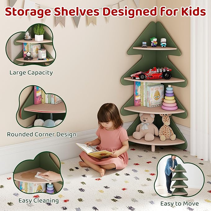 Tree Bookshelf for Kids, 4-Tier Montessori Corner Bookcase, Space-Saving Freestanding Storage Organizer for Books & Toys, Suitable for Kids Room, Playroom, Classroom, Nursery