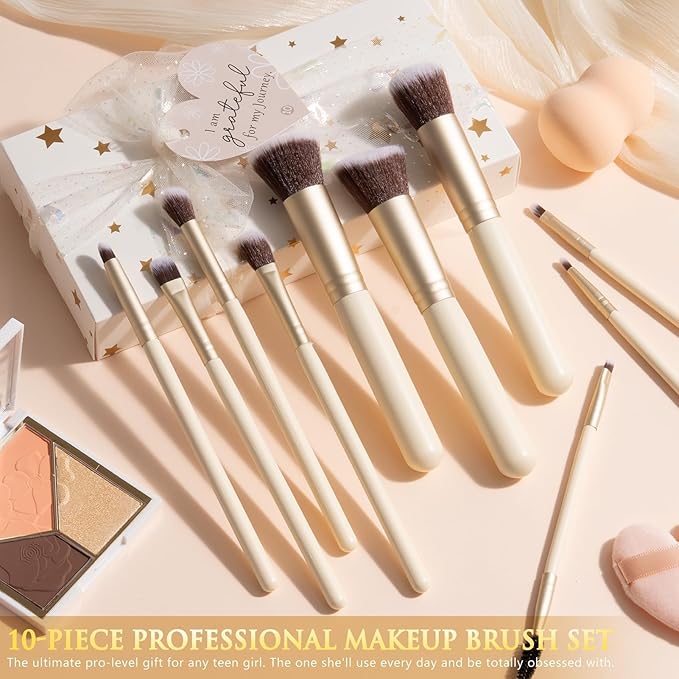 - 10PCS TWEEN GIRLS TREND STUFF: This birthday makeup girls gift including 10 Makeup Brushes, Floral print Makeup Bag, 11 Makeup Sponges with Bottle, Headband, Dual Wristbands, 3 Flower Hair Clips, 24 PCS Press On Nails with Polish Strip & Glue, 6 Lip Gloss Set, 25 Color Eyeshadow, 3 in 1 Face Palette, Eyebrow Pencil, Eyeliner, Mascara, Bowknot Ribbon, 10 Affirmation Cards & Task Tags. These teen girl gifts trendy stuff cover from makeup tools to cosmetics, more than make up, it's a confidence kit