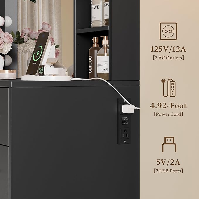 - 【Adjustable LED Lighting & Built-In Power Outlet】Equipped with 10 adjustable LED bulbs, this vanity ensures you have optimal lighting for makeup application and grooming. The brightness is fully customizable, giving you perfect illumination whether you're applying makeup or styling your hair. The built-in power outlet allows you to charge your phone, curling iron, or other devices while you get ready, adding convenience to your routine