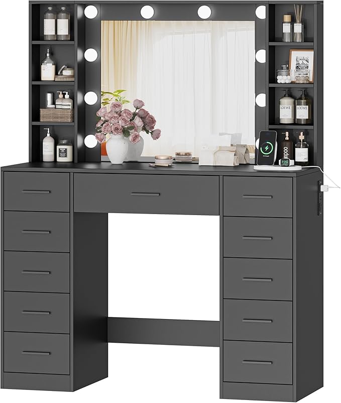 Makeup Vanity with Drawers, 43" Black Vanity Desk with Mirror and Lights, 11 Drawers & 4 Shelves, Power Outlet & Adjustable LED Lights, Dressing Table for Women & Girls Bedroom
