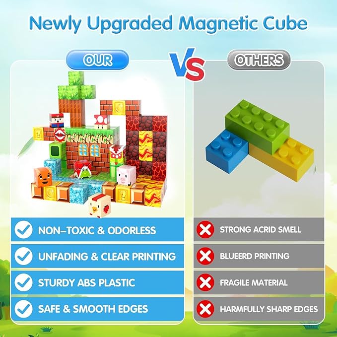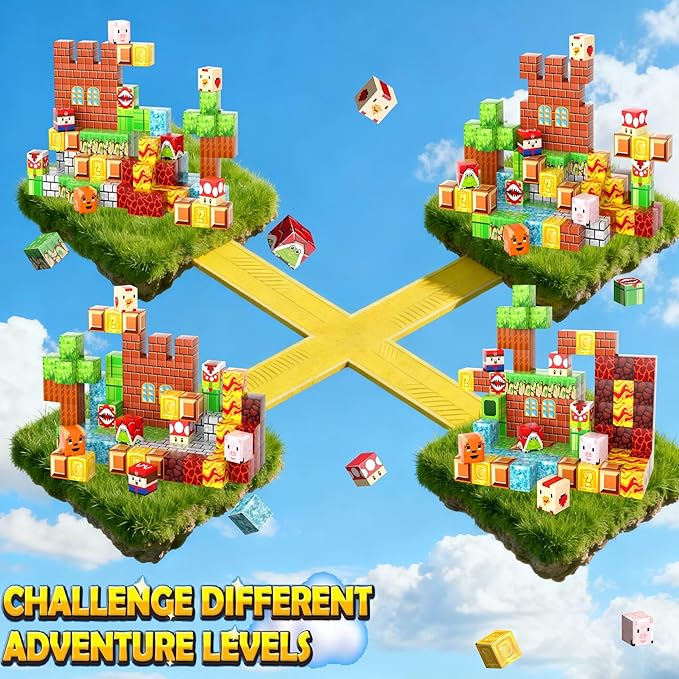 - 【Endless Creative Possibilities】The kids' toys set will drive Game fans crazy! The building toy includes various elements, stone, gold coins, random blocks, figures, mushrooms, windows and doors, man-eating flowers, turtles, etc. We can create our own level-breaking game. The magnetic toy can be stacked on the desktop or built on a garage door, refrigerator door, or anything iron. Let's design a level-breaking match together