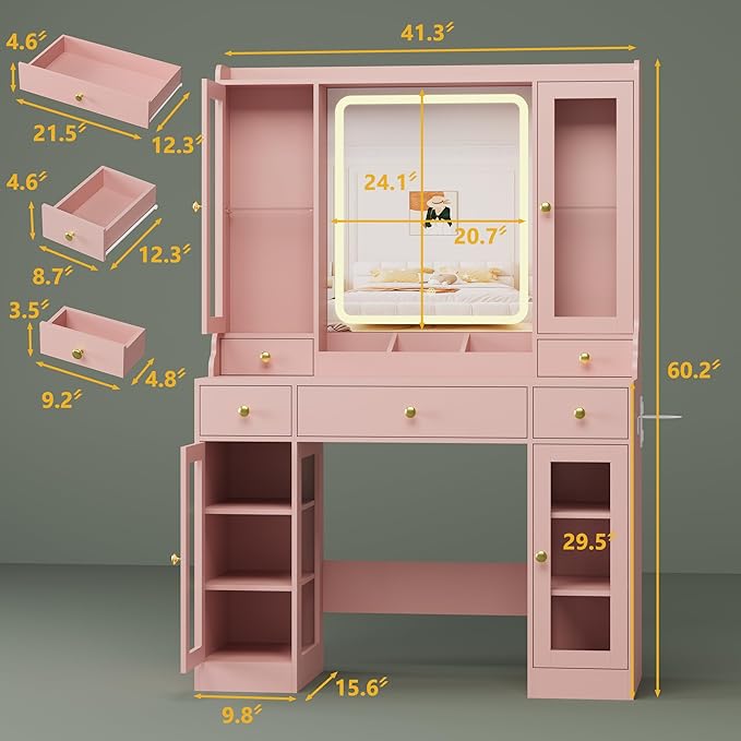 - Vanity Desk with Ample Storage Space: BORNOON makeup vanity with big drawers measures 15.6"D x 41.3"W x 60.2"H. It includes 3 practical makeup trays for organizing cosmetics and skincare products, along with 5 drawers and 4 cabinets with adjustable shelves to accommodate various storage needs. Whether it's makeup tools, jewelry, or skincare bottles, everything has a place, keeping your vanity desk neat and organized.