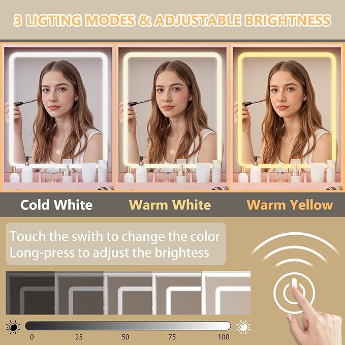 - Vanity Mirror with Lights & Adjustable RGB Ambience: BORNOON makeup vanity desk features a large mirror with three color modes—cool white, warm white, and warm yellow—and adjustable brightness to suit any time of day. RGB lights inside the cabinets add a modern touch and enhance the bedroom vanity experience with stylish ambiance and personalization.