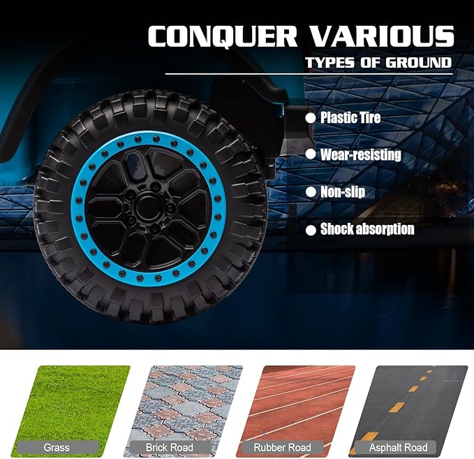 - ⚡ ​​Powerful 4WD & Enhanced Suspension for Off-Road Excursions​​ Engineered for little explorers! The robust ​​4-wheel drive (4WD)​​ system, combined with advanced spring suspension and soft EVA wheels, provides superior traction and a smooth ride on various terrains—from grass and dirt paths to gentle slopes. It’s designed to handle outdoor adventures with ease and stability