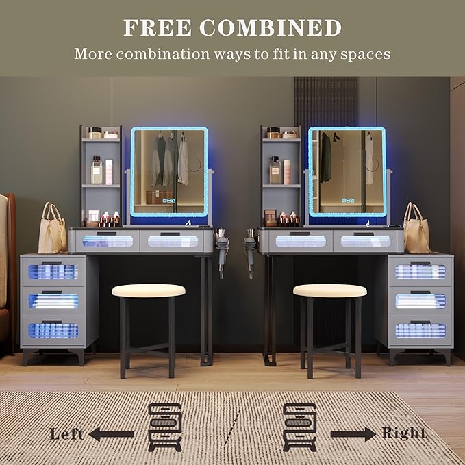 HNEBC Vanity with LED Mirror, Glass Top Dresser with Wireless Charging Station for Bedroom, Small Makeup Desk with 6 Drawers, Girls Dressing Table with Auto RGB Lighted for Christmas (5078-Grey)