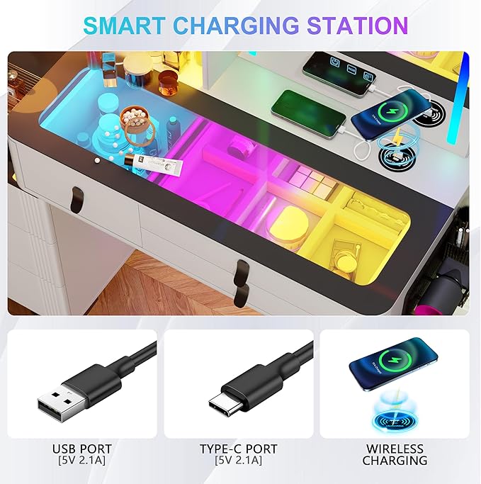 - 🌺【3-IN-1 Charging Station】HNEBC vanity with wireless/USB/type-c charging station, Meet the charging needs of your different electronic products