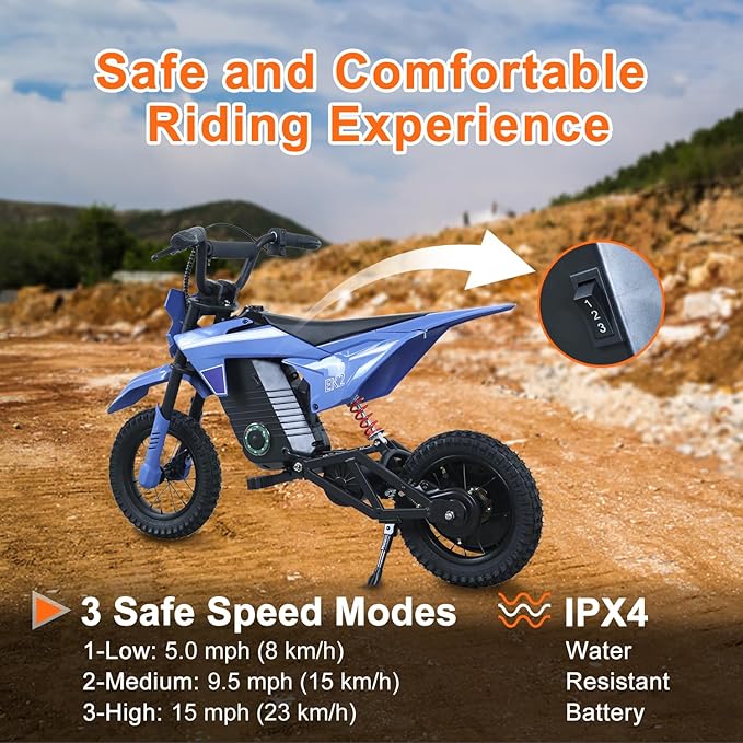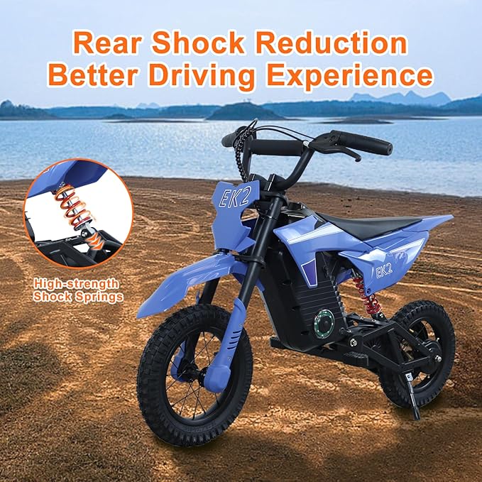 - Safety is a top priority with the EK2 electric dirt bike. Equipped with a rear roller brake and 3 safe speed modes, this kids dirt bike offers quick and reliable braking response. The rear shock reduction high-strength shock spring provide a smooth ride over bumps and rough terrain, while the 12" off-road pneumatic rubber tires offer excellent grip in various conditions.