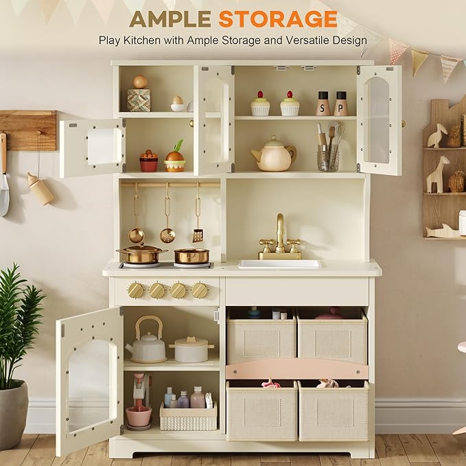 - Larger Storage Space: Our unique storage system ensures every toy set has a home! With many cabinets, clear acrylic doors, and 4 felt label-ready storage bins(labels not included), this kids kitchen playset helps your child master sorting skills. Keep all toy kitchen accessories tidy and accessible, fostering a love for organization.