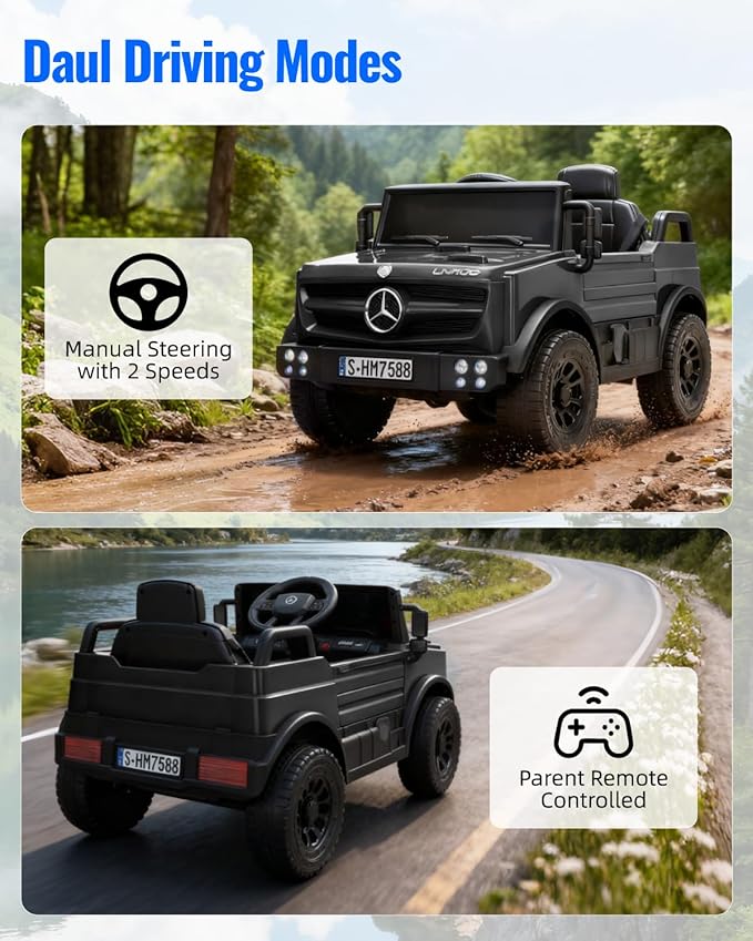 - 【Parent Remote Control & Ride-On Mode】: 12V Unimog Jeep, Designed for young children, this 12V Unimog jeep includes a dedicated parent remote control. Parents can instantly stop the vehicle in emergencies to ensure child safety. The manual ride-on mode is ideal for supervised use in secure, controlled environments.