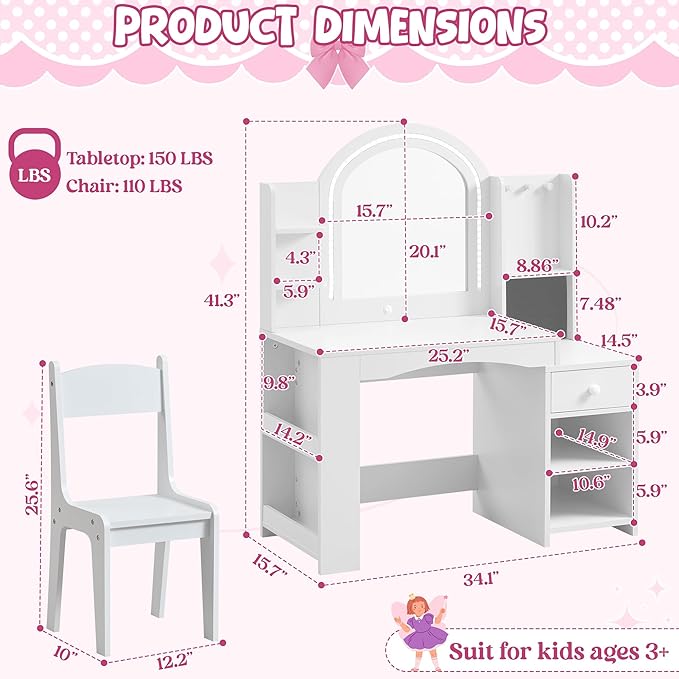 - 👑【Adorable Princess Gift Kids Love】- With cute crown accents and a charming modern style, this girls vanity with mirror transforms playtime into a magical princess experience. A thoughtful gift that encourages imaginative play — perfect for birthdays, Christmas, or room makeovers.