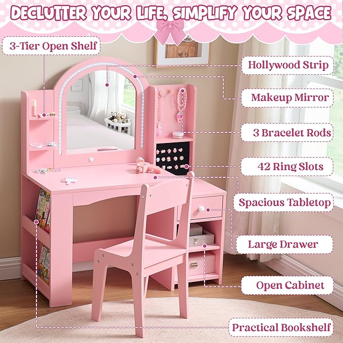 - 📚【Multi-Functional Storage for Growing Needs】- More than a makeup vanity — this 2-in-1 design includes an open bookshelf, spacious tabletop, 3-tier display shelf, slide-out drawer, and enclosed cabinet. Ideal for organizing cosmetics, toys, books, and décor, helping children keep their room tidy and clutter-free.