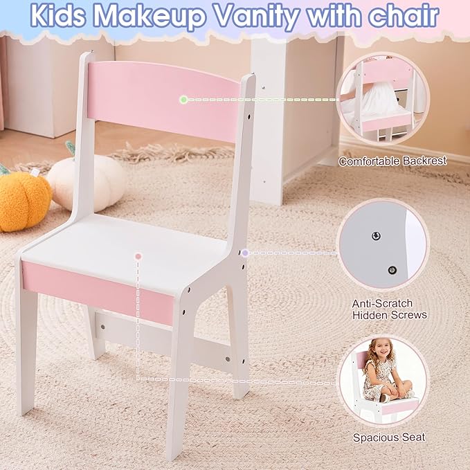 - 【Ergonomic Kids' Vanity Chair】The included girl vanity chair features a scientifically contoured backrest for stable spinal support, promoting healthy posture during play. Its spacious, cozy seat ensures comfort and serves as a perfect little resting spot